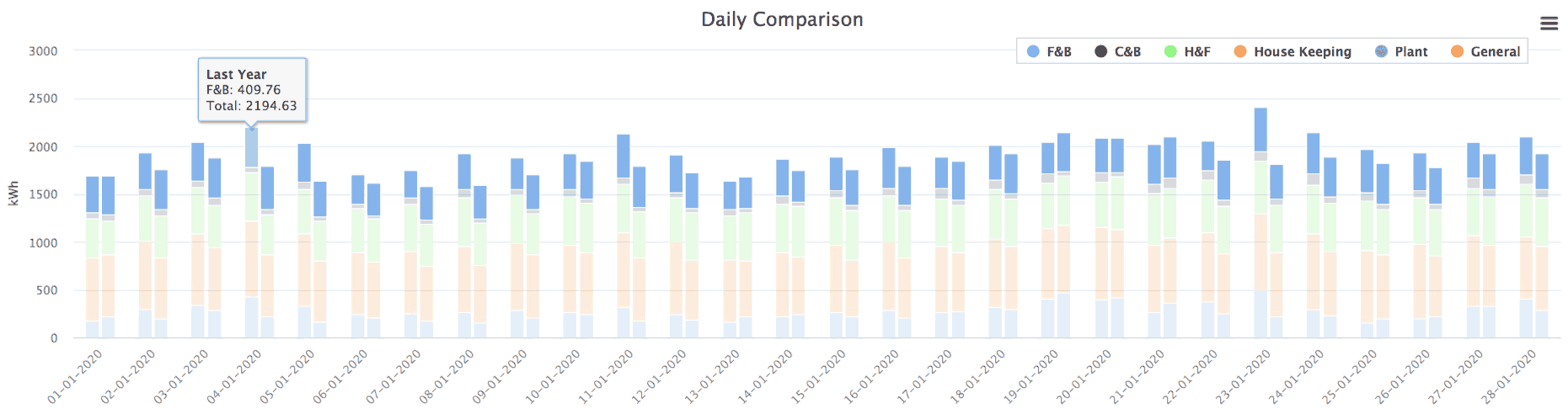 Real-time graphs and charts where each department is compared against consumptions over variable periods.